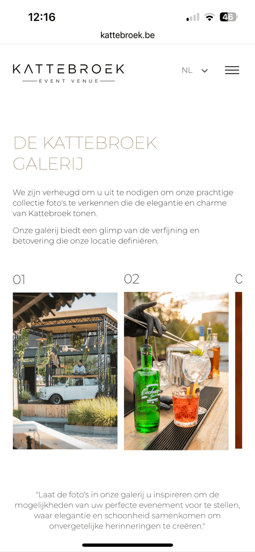 Om de feestzaal op een bijzondere manier te presenteren en bezoekers een inspirerende inkijk te geven in de diverse mogelijkheden en het prachtige decor, werd een uitgebreide galerij ontwikkeld. Deze galerij stelt gebruikers in staat om eenvoudig te filteren en zo een visuele voorstelling te krijgen van hoe hun potentiële feest eruit zou kunnen zien. Door deze interactieve functie kunnen toekomstige klanten zich beter voorstellen hoe de feestzaal aangepast kan worden aan hun specifieke wensen en voorkeuren, wat hun besluitvormingsproces vergemakkelijkt en hen enthousiasmeert voor een evenement bij Kattebroek.